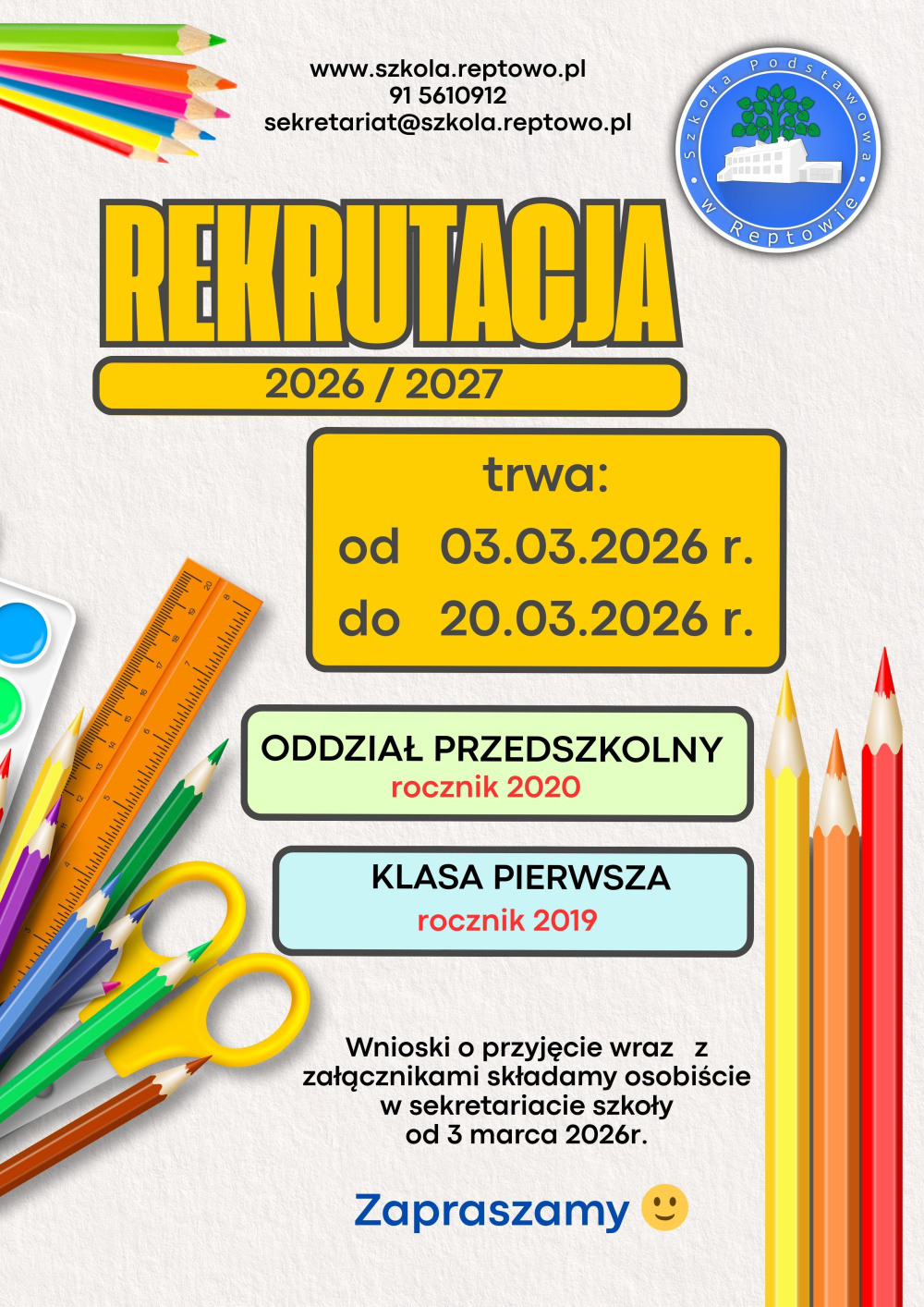 Od dnia 3 marca przyjmowane są w sekretariacie szkoły (osobiście) wnioski o przyjęcie do oddziału przedszkolnego i klasy pierwszej szkoły podstawowej.